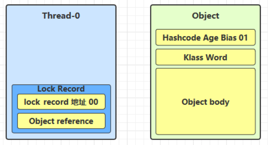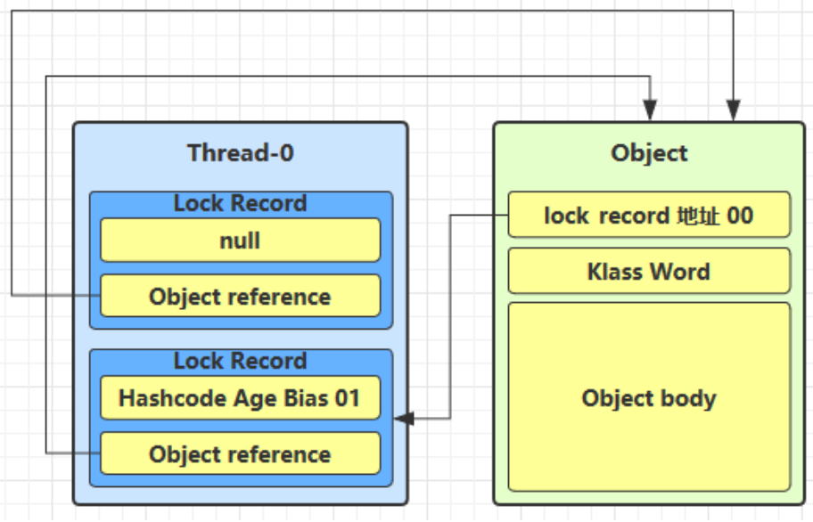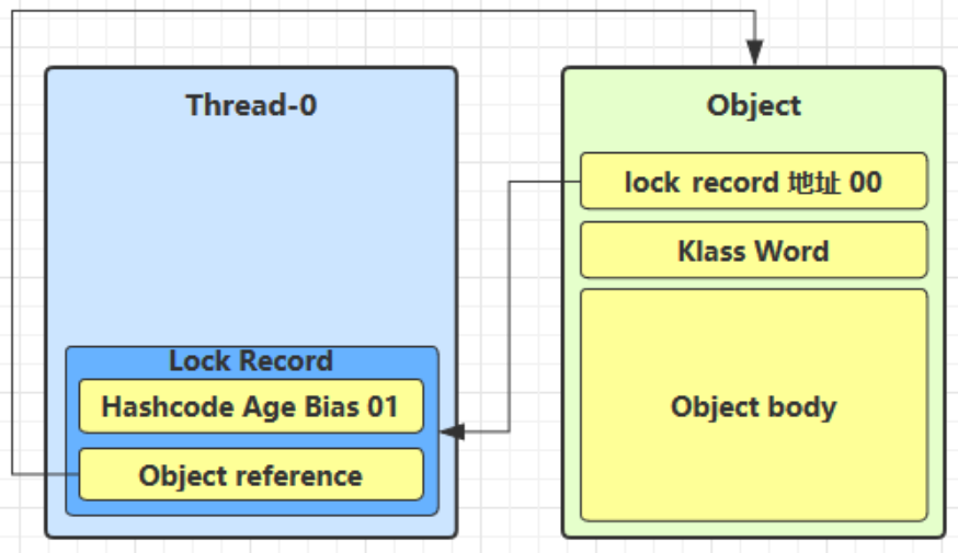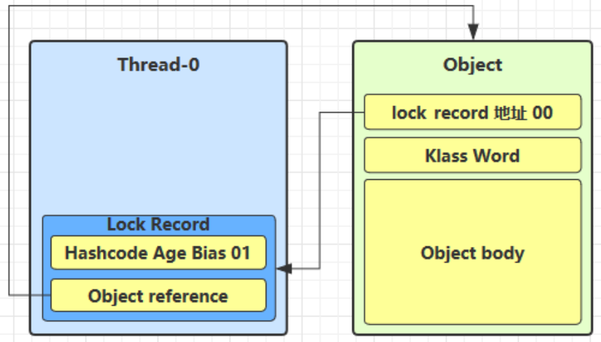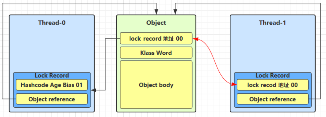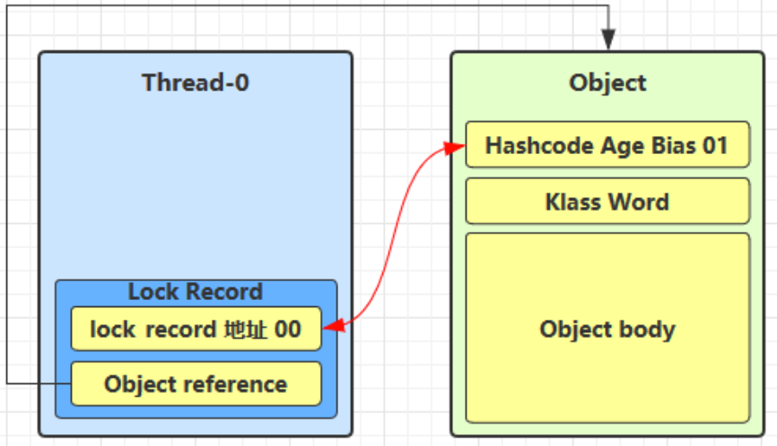 如果 cas 替换成功(锁对象状态为00),对象头中存储了锁记录地址和状态 00 ,表示由该线程给对象加锁,这时图示如下