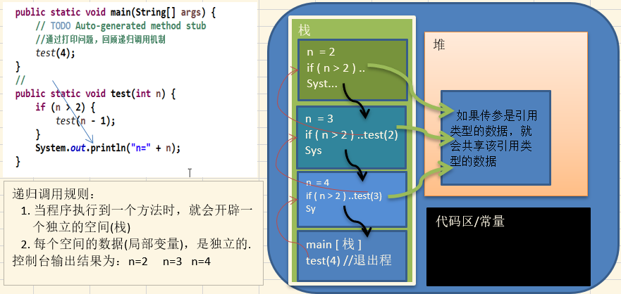 必须向退出递归的条件逼近,否则就是无限递归,出现StackOverflowError栈溢出了。 - 当一个方法执行完毕,或者遇到return,就会返回,遵守