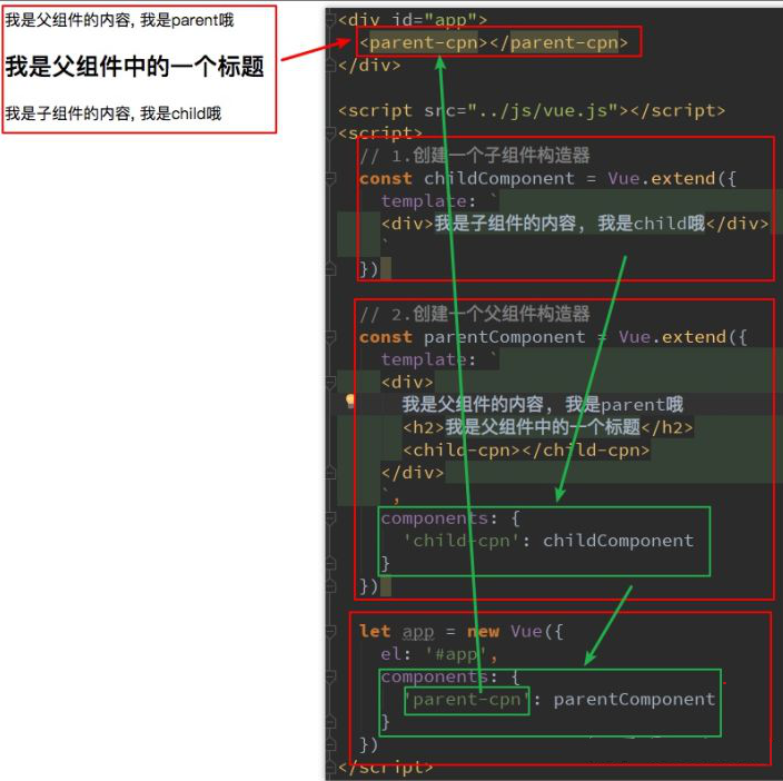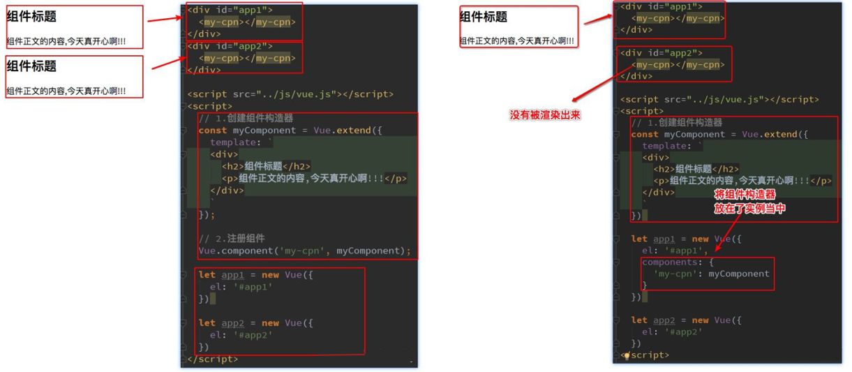 Vue.component()是将刚才的组件构造器注册为一个组件并且给它起一个组件的标签名称 - 所以需要传递两个参数:① 注册组件的标签名 ② 组件构造器