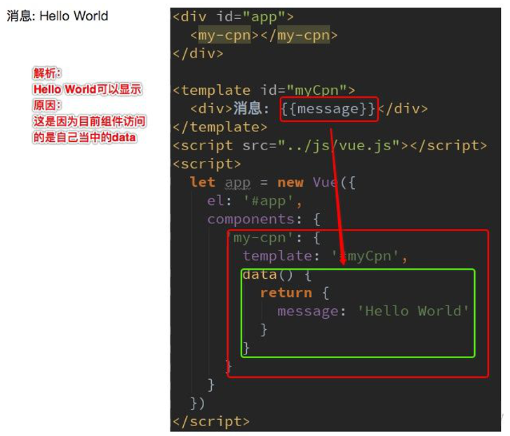 - 结论:组件并不能直接访问Vue实例中的data,Vue组件应该有自己保存数据的地方
