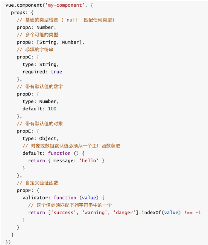 props数据验证:在前面我们的props选项是使用一个数组,除了数组之外我们也可以使用对象,当需要对props进行类型等验证时就需要对象写法了