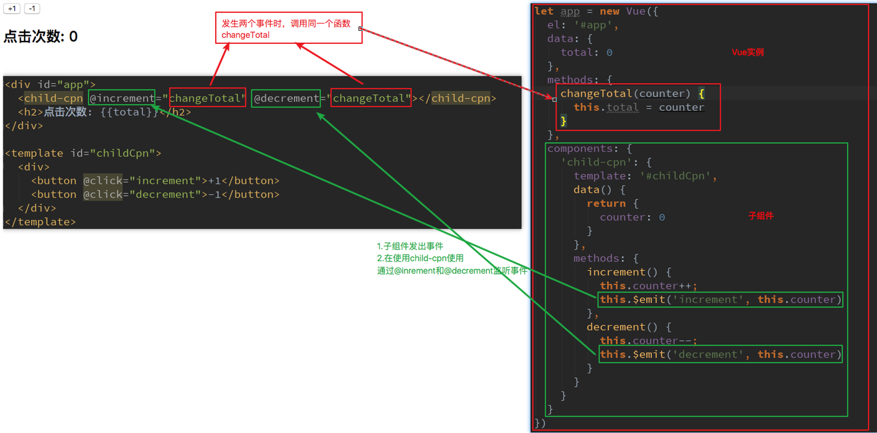 +1和-1,点击后修改counter - 我们整个操作的过程还是在子组件中完成,但是之后的展示交给父组件
