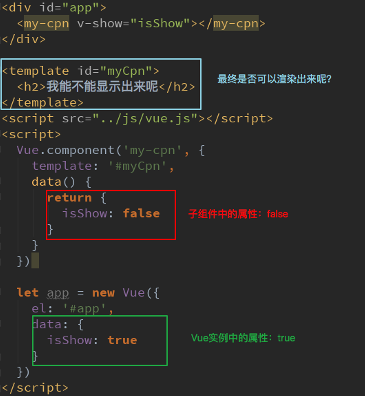 - 因此 isShow使用的是Vue实例中的属性,而不是子组件的属性