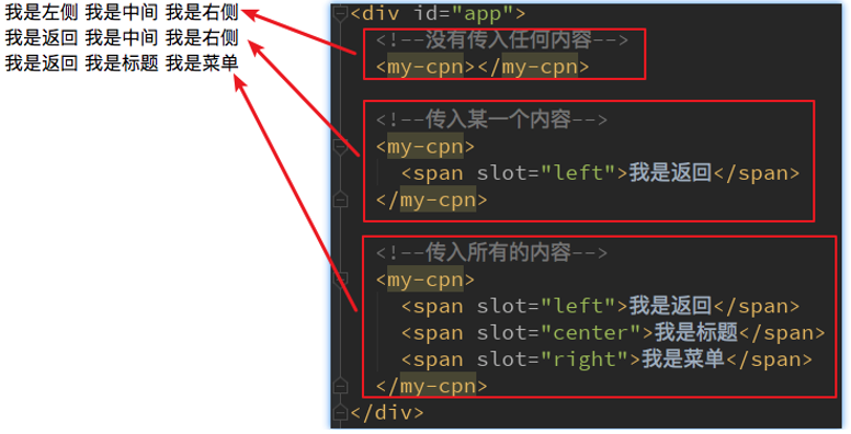 当子组件的功能复杂时,子组件的插槽可能并非是一个。比如我们封装一个导航栏的子组件,可能就需要三个插槽,分别代表左边、中间、右边。