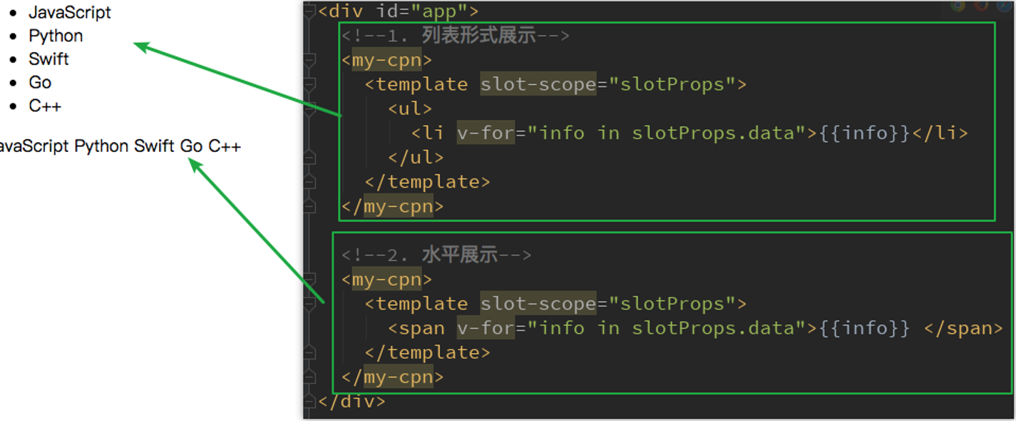 作用域插槽是slot一个比较难理解的点,而且官方文档说的又有点不清晰。这里,我们用一句话对其做一个总结,然后我们在后续的案例中来体会:父组件替换插槽的标签,但是内容由子组件来提供。