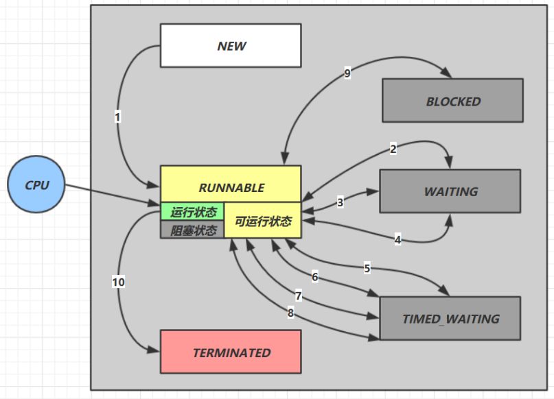 阻塞状态的细分,后面会在状态转换一节 详述 - TERMINATED: 当线程代码运行结束