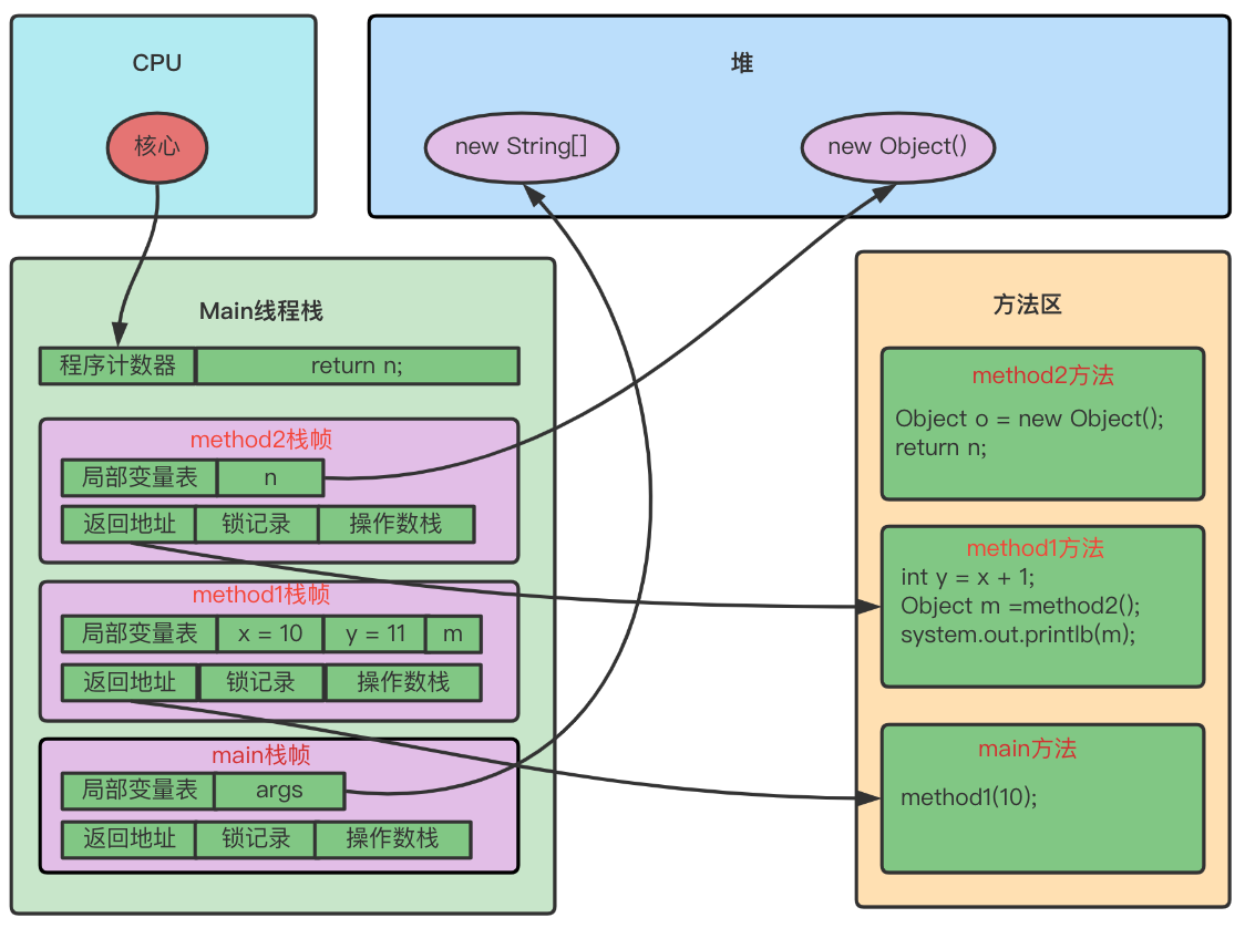- 每个栈由多个栈帧(Frame)组成,对应着每次方法调用时所占用的内存