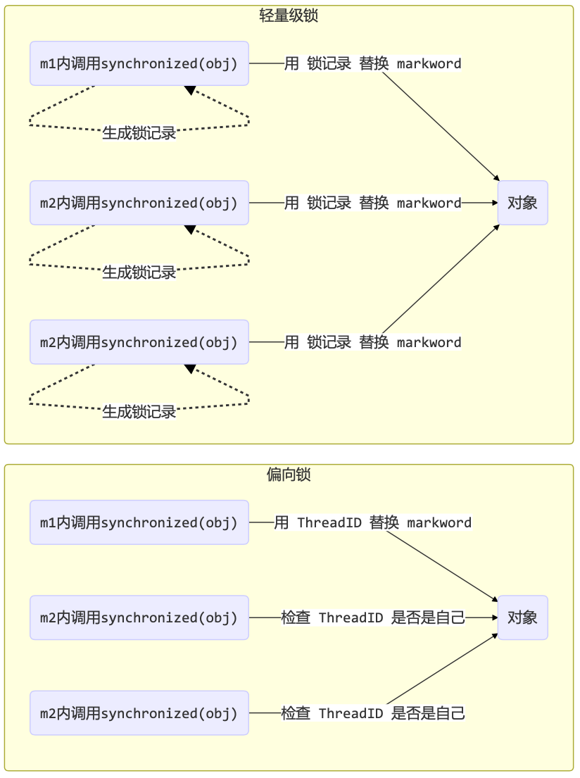 从Java6开始,对synchronized获取锁的方式进行了一些改进,从直接使用monitor锁改成了还可以使用轻量级锁、偏向锁。