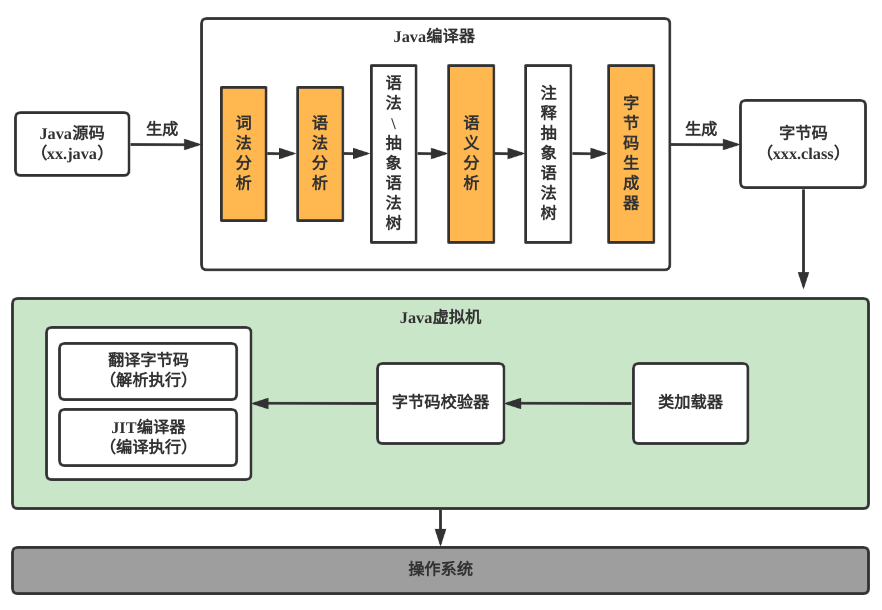 Java虚拟机就是二进制字节码的运行环境,负责装载字节码到其内部,解释/编译为对应平台上的机器指令执行。每一条Java指令,Java虚拟机规范中都有详细定义,如怎么取操作数,怎么处理操作数,处理结果放在哪里。