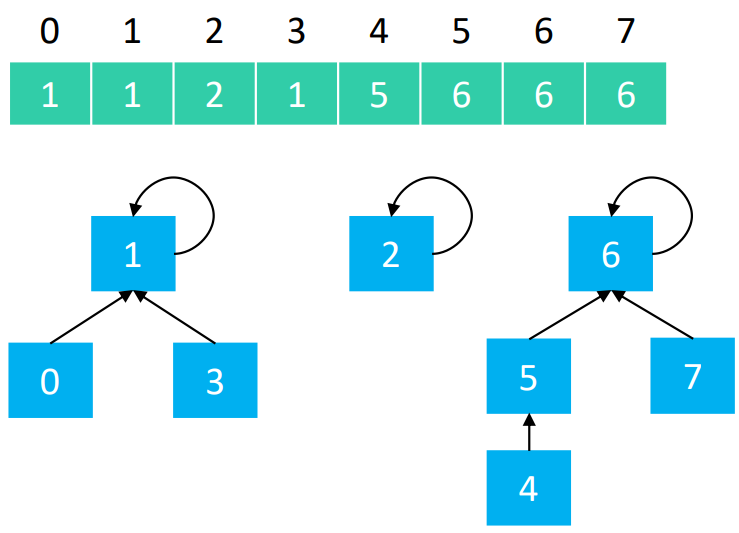 因此并查集是可以用数组实现的树形结构(二叉堆、优先级队列也是可以用数组实现的树形结构)