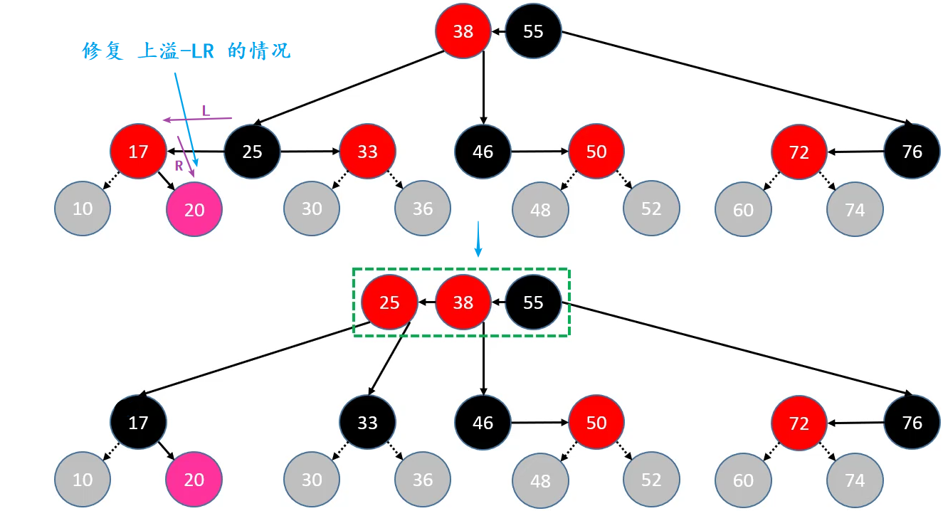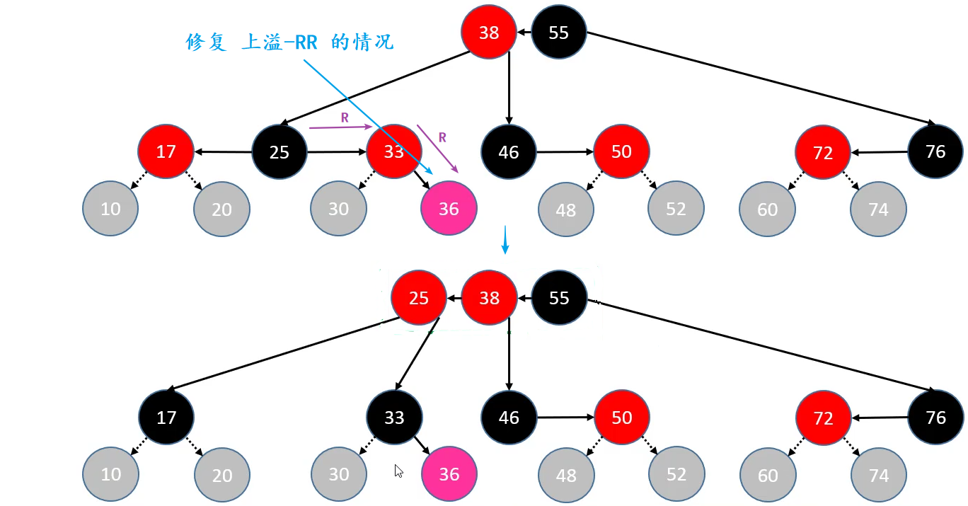 //类型二:parent是红色且uncle是红色(会上溢的四种情况)