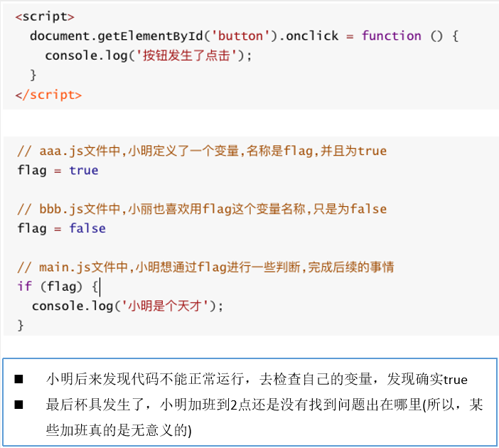 但是这种维护方式依然不能避免一些灾难性的问题,比如全局变量同名问题如下面的案例。另外这种代码的编写方式对js文件的依赖顺序几乎是强制性的,当js文件过多比如有几十个的时候弄清楚它们的顺序是一件比较同时的事情,而且即使你弄清楚顺序了也不能避免下面案例出现的这种尴尬问题的发生。