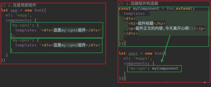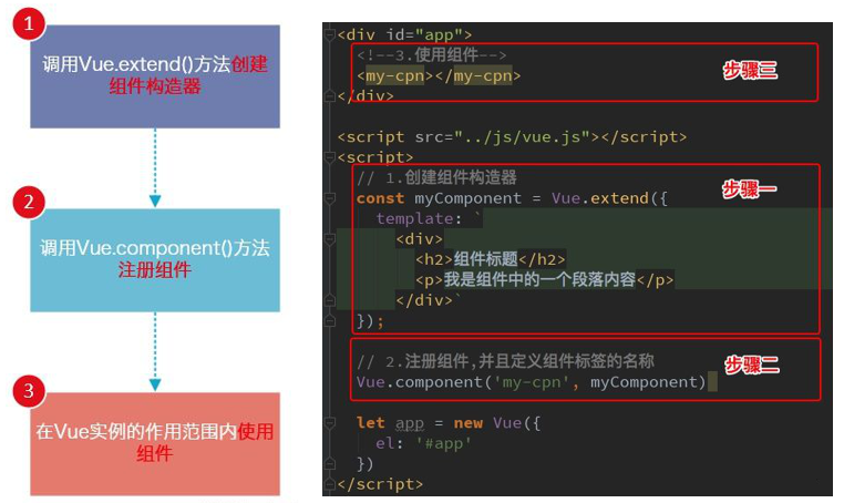 Vue.component()是将刚才的组件构造器注册为一个组件并且给它起一个组件的标签名称 - 所以需要传递两个参数:① 注册组件的标签名 ② 组件构造器