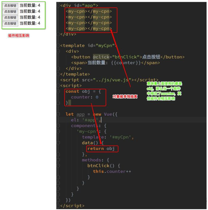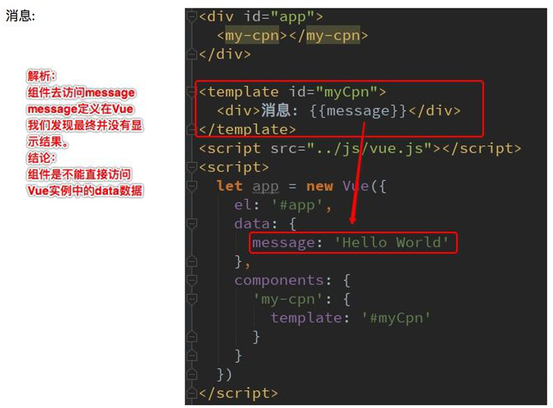- 结论:组件并不能直接访问Vue实例中的data,Vue组件应该有自己保存数据的地方