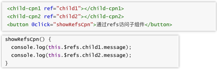 $children访问子组件时,是一个数组类型,访问其中的子组件必须通过索引值。但是当子组件过多,我们需要拿到其中一个时往往不能确定它的索引值,甚至还可能会发生变化有时候我们想明确获取其中一个特定的组件,这个时候就可以使用