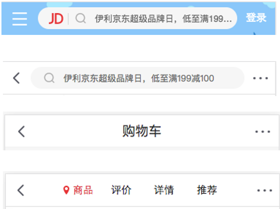 如何去封装京东M站导航栏这类的组件呢?它们也很多区别,但是也有很多共性,如果我们每一个单独去封装一个组件显然不合适:比如每个页面都返回,这部分内容我们就要重复去封装。但是如果我们封装成一个好像也不合理:有些左侧是菜单,有些是返回,有些中间是搜索,有些是文字等