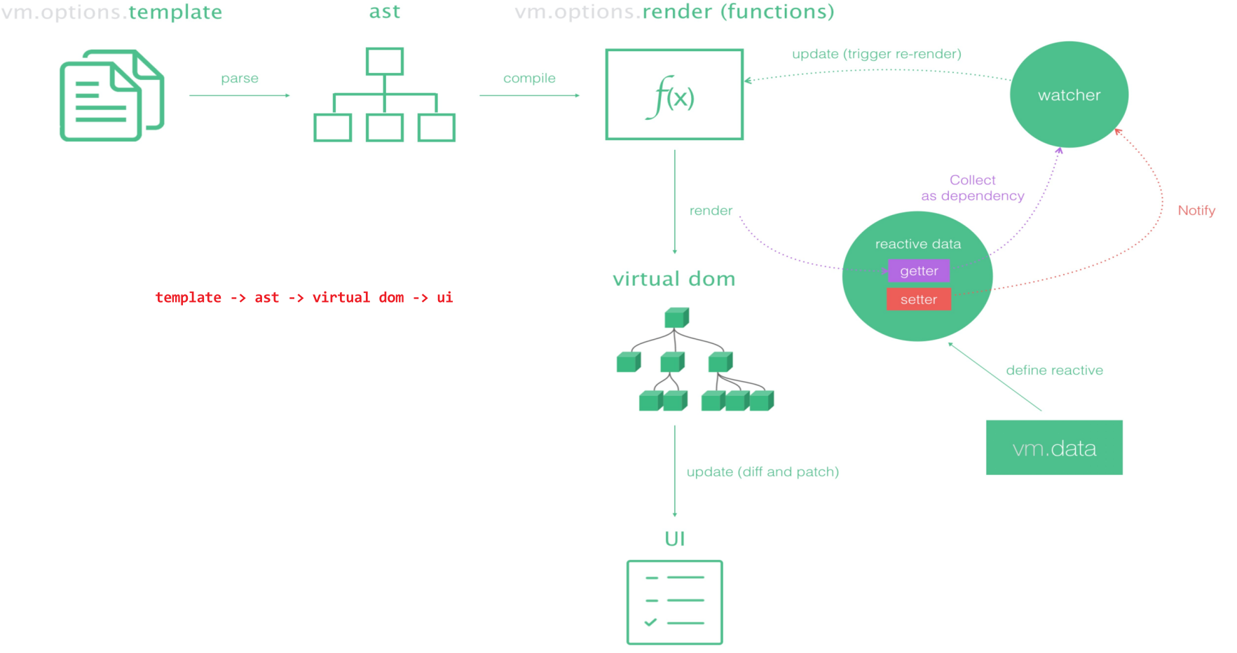 })为什么会出现这样的差异呢?我们需要先理解Vue应用程序是如何运行起来的,Vue中的模板如何最终渲染成真实DOM。我们来看下面的一幅图。
